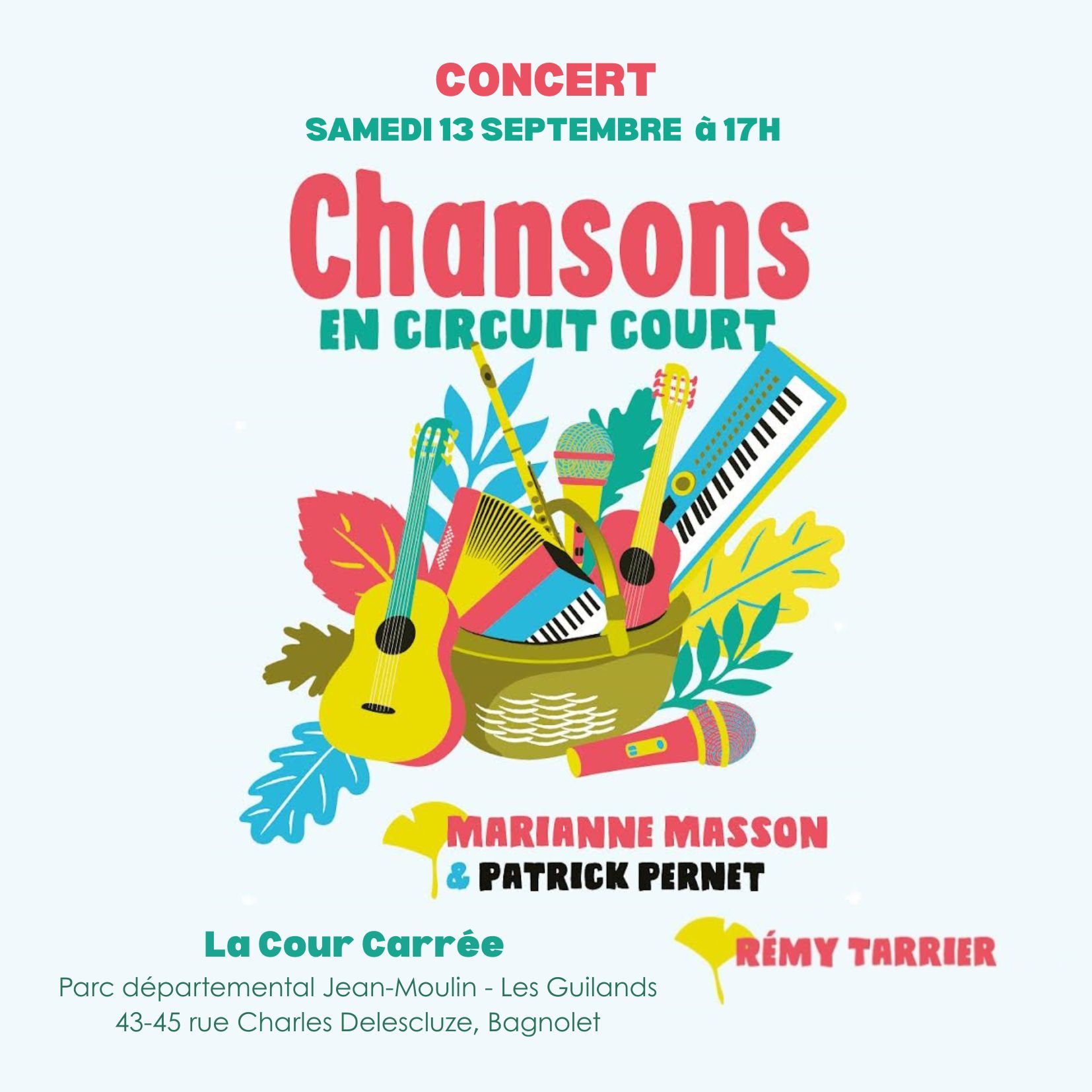🎼 17h - Deux concerts en un avec Rémy Tarrier et Marianne Masson : nos chansons d'aujourd'hui accompagnées par Patrick Pernet. Musicalement folk malicieux et vagabond. Flûte guitare et piano . Esprit? tendresse et humour.